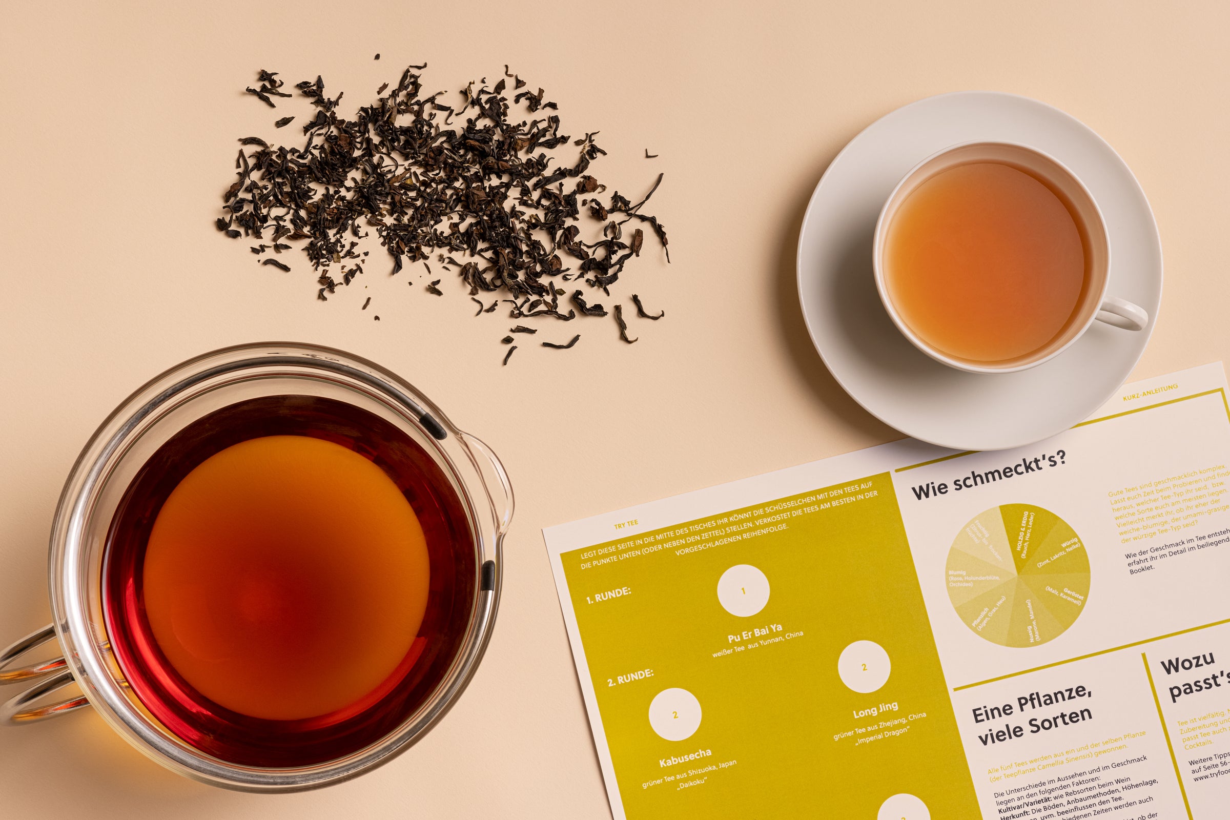Im Set findet ihr alle Infos, um zu Hause mit Freunden oder Familie ein eigenes Tee-Tasting zu veranstalten. Neben dem 60-seitigen Booklet liegt dem Set auch eine Anleitung mit Tipps zur Vorbereitung und Durchführung eurer eigenen Verkostung bei.